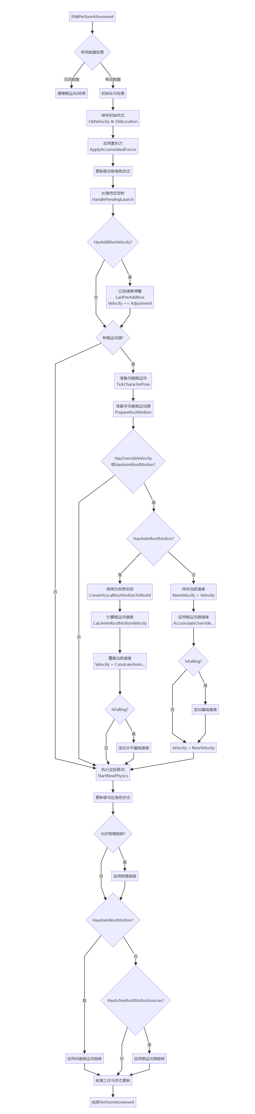 1 2 3 4 5 6 7 8 9 10 11 12 13 14 15 16 17 18 19 20 21 22 23 24 25 26 27 28 29 30 31 32 33 34 35 36 37 38 39 40 41 42 43 44 45 46 47 48 49 50 51 52 53 54 55 56 57 58 59 flowchart TD A[开始PerformMovement] --> B{有效数据检查} B -- 无效数据 --> C[清理根运动/结束] B -- 有效数据 --> D[初始化与检查] D --> E[保存初始状态\nOldVelocity & OldLocation] E --> F[应用累积力\nApplyAccumulatedForces] F --> G[更新移动前角色状态] G --> H[处理待定发射\nHandlePendingLaunch] %% 追踪外部速度变化 H --> I{HasAdditiveVelocity?} I -- 是 --> J[记录速度调整\nLastPreAdditive\nVelocity += Adjustment] I -- 否 --> K{有根运动源?} J --> K %% 准备根运动 K -- 是 --> L[准备动画根运动\nTickCharacterPose] K -- 否 --> Q L --> M[准备非动画根运动源\nPrepareRootMotion] %% 应用根运动到速度 M --> N{HasOverrideVelocity\n或HasAnimRootMotion?} N -- 是 --> O{HasAnimRootMotion?} N -- 否 --> Q %% 动画根运动处理 O -- 是 --> P1[转换为世界空间\nConvertLocalRootMotionToWorld] P1 --> P2[计算根运动速度\nCalcAnimRootMotionVelocity] P2 --> P3[覆盖当前速度\nVelocity = ConstrainAnim...] P3 --> P4{IsFalling?} P4 -- 是 --> P5[添加水平基础速度] P4 -- 否 --> Q P5 --> Q %% 非动画根运动处理 O -- 否 --> O1[保存当前速度\nNewVelocity = Velocity] O1 --> O2[应用根运动源速度\nAccumulateOverride...] O2 --> O3{IsFalling?} O3 -- 是 --> O4[添加基础速度] O3 -- 否 --> O5[Velocity = NewVelocity] O4 --> O5 O5 --> Q %% 执行移动和后续处理 Q[执行实际移动\nStartNewPhysics] --> R[更新移动后角色状态] R --> S{允许物理旋转?} S -- 是 --> T[应用物理旋转] S -- 否 --> U{HasAnimRootMotion?} T --> U %% 应用根运动旋转 U -- 是 --> V1[应用动画根运动旋转] U -- 否 --> V2{HasActiveRootMotionSources?} V1 --> W[收尾工作与状态更新] V2 -- 是 --> V3[应用根运动源旋转] V2 -- 否 --> W V3 --> W W --> X[结束PerformMovement]